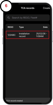 3. Tap the Record type drop down menu and select Installation record. Enter your vehicle registration, fleet number, or serial number and select the device when prompted.